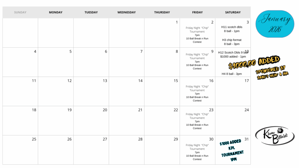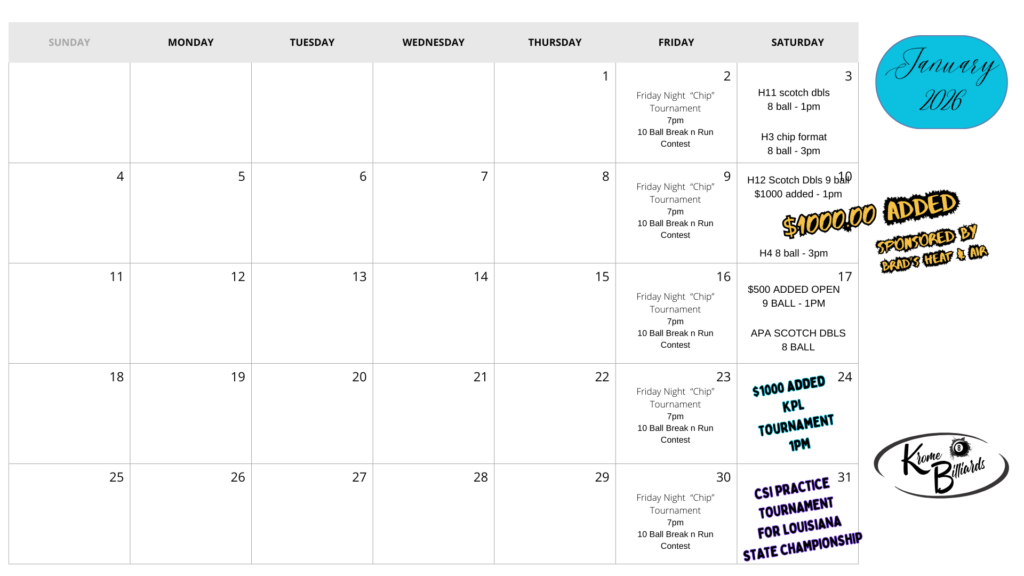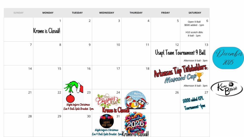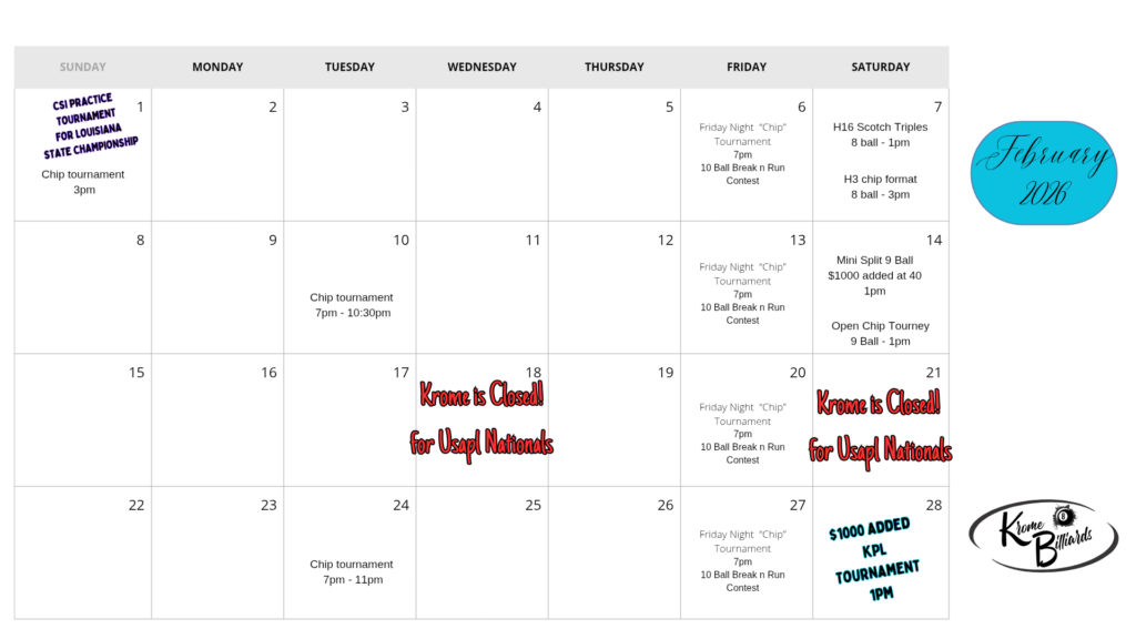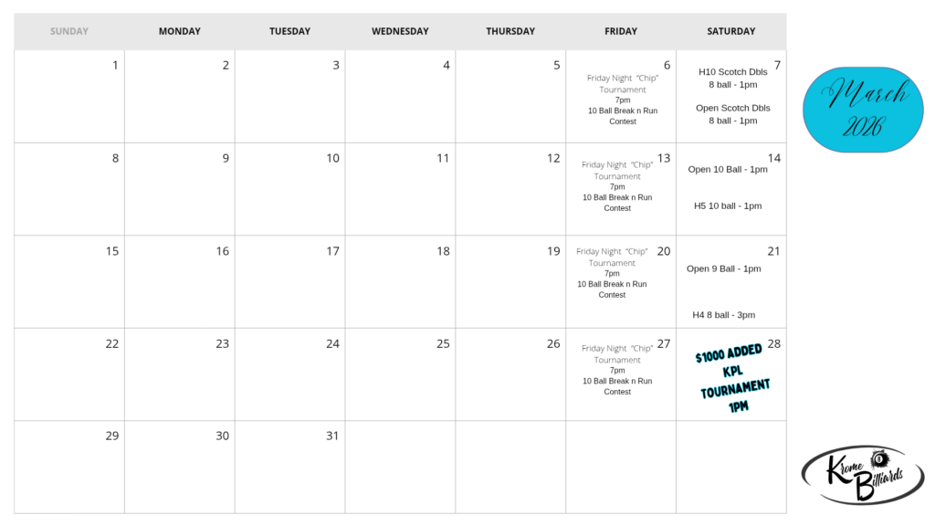 Monday. Tues, Wed & Friday open at 5pm..... Thurs open @ 3pm..... Saturday open at Noon..... Sundays - Closed except during tournaments